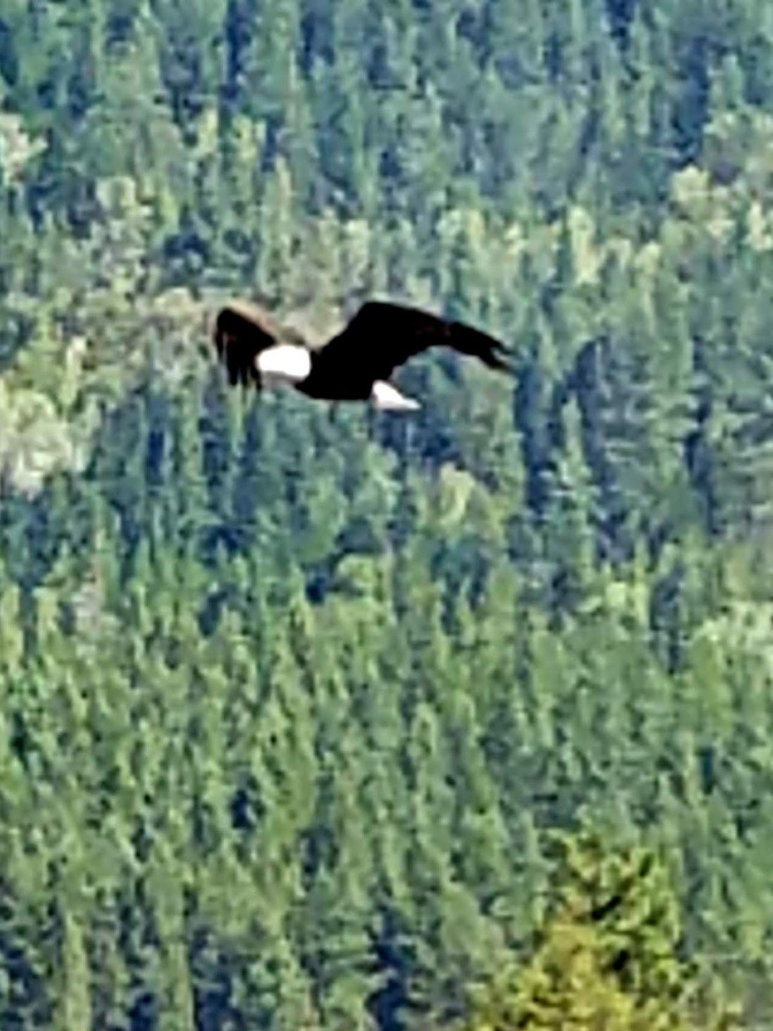 After our good experience with the visitors information in Kimberley, I took a chance. It was a good thing I did because the store owner made it clear that the Great Trail route out of Nelson was essentially a hard mountain bike route and best to be avoided with 80 lb bikes. This may have saved my marriage and so not only was it worth going his recommended route it was actually much more pleasant and off the highway. In fact as we followed a dirt road out of Nelson we came across what is rarely seen in the US, despite it being our national bird. This one swooped so close that we thought he was coming for us.