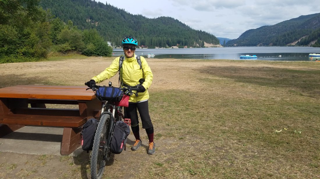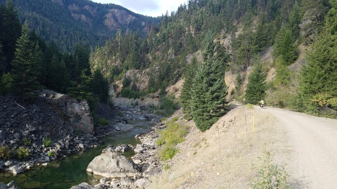 Eventually we headed north toward Merritt. It was out of our way, but our destination so we could spend Sunday where there was a church. Unfortunately, Google Maps believed there was a Rail Trail that continued North as well as South to Hope our destination on Monday. We should have recognized the signs as the trail got less and less worn but we didn’t want to turn back. Our hopes were eventually dashed as we came to a huge steep washed out section that was impassable and we had to turn back to catch the road. On a long day, that was frustrating, but we did have a tail wind that pushed us in to Merrit. A surprisingly hot and dry area that gets very little rain or snow according to the “why live in Merritt” website:).