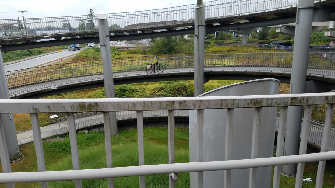 Today we swam from Langley tune in West Vancouver. The weather report indicated a 40% chance of rain. We interpreted that positively but erroneously. Apparently 40% in Vancouver means that 40% of the time you were getting wet directly from falling rain and the other 60% you’re getting wet from water dripping off of the dense vegetation. I hate to say it, but it was a bit of along day again. No doubt, no one feels sorry for us nor should they as we still are blessed to be in this beautiful place and the chance we have to be together.Early on today we went over our first major bridge heading back to the north. Well the bridge itself was impressive oh, the most amazing part was the amount of construction and energy that had gone into a bike lane including a slowly ramp spiral up-to-date private bike lane across the bridge. It was definitely an improvement over our last Bridge Crossing.