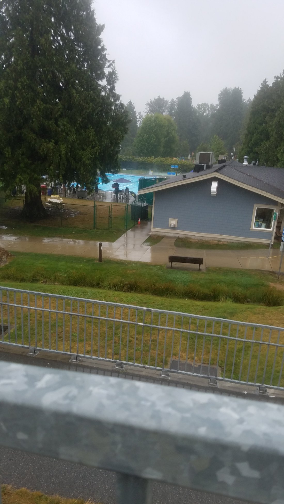 It was an outdoor Cafe for Charlie or we would not have been able to go in. We were a muddy, soggy mess. Amazingly, rain does not stop activities in Vancouver. We passed two different swimming pools where people were swimming Outdoors like it was a regular summer day. Apparently rain here does not come with lightning or they don’t care.