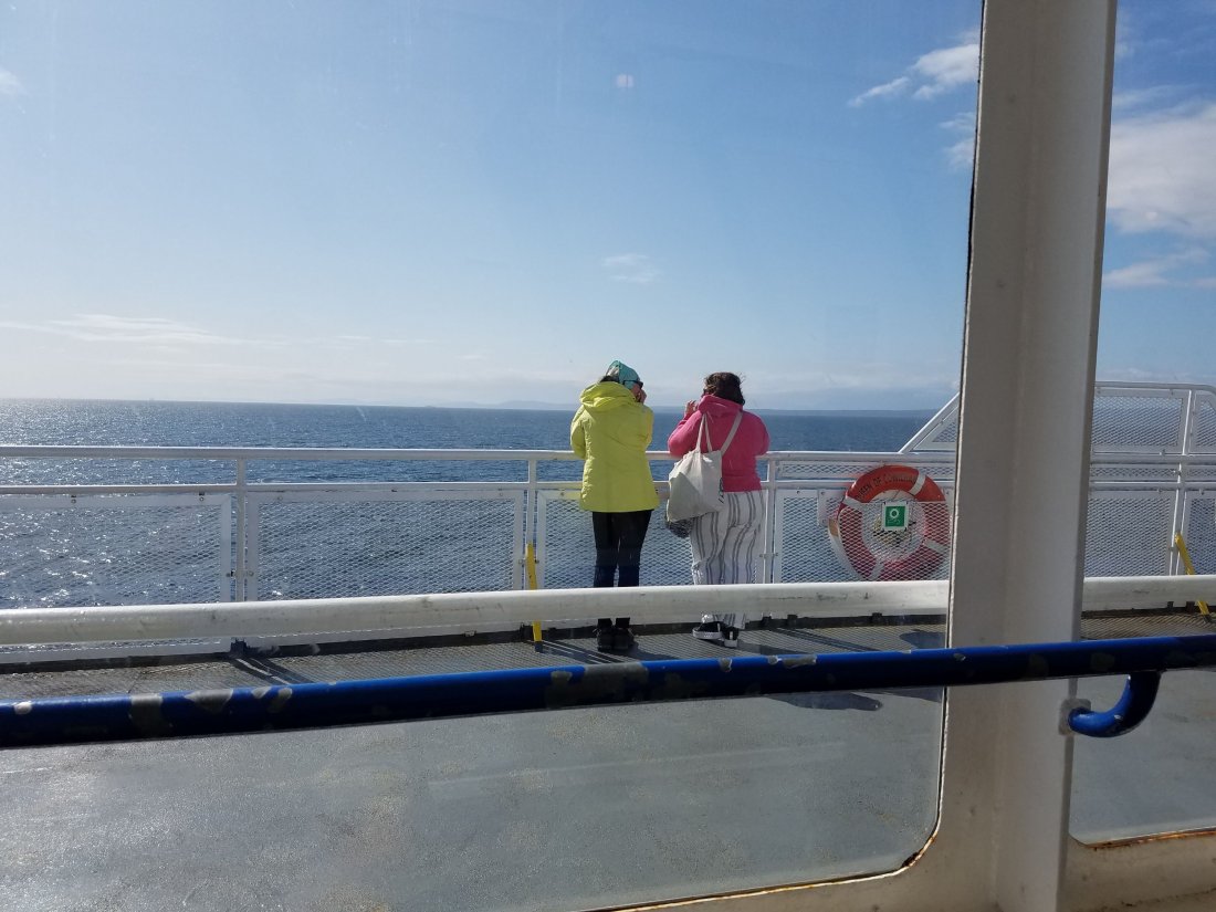 Gloria didn’t waste any time on the ferry as she visited with many people. This is a picture of her new best friend from Scotland visiting her cousin on the island. She had been told by her cousin that on the ferry she had seen dolphins, whales and Shamu. Unfortunately they were all absent today.