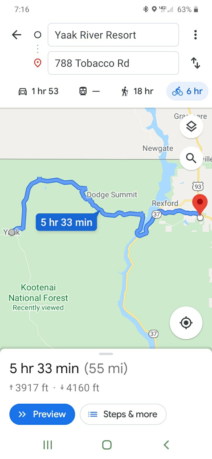 Yaak River Lodge turned out to be a nice place to stay for the night. From there we would spend the next 4 hours climbing 30 miles to the top of Dodge Summit several thousand feet higher than Yaak. We would coast down to Koocanusa lake and then find our way back to our starting point in Eureka for the end of our trip. We had originally planned to go down to Jennings, spend the night, and then head up to Eureka. However when we saw the route through the northern country we decided to cut the trip a day short so we could spend more time with our daughter’s family on the way home..