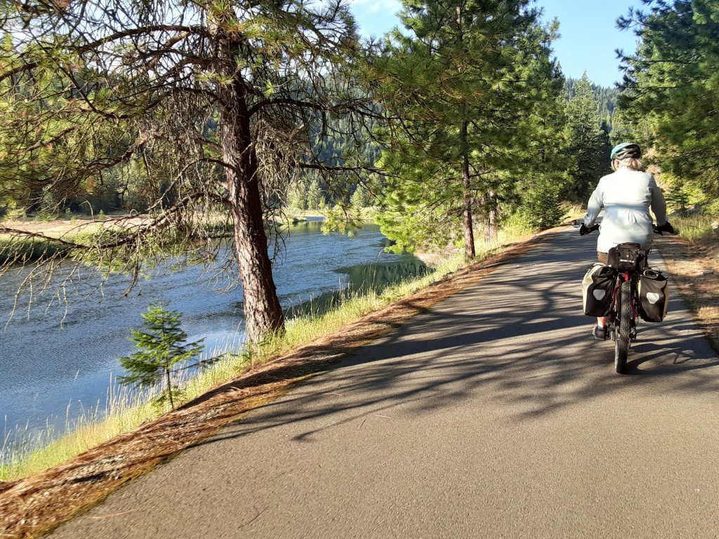 I purposely failed to put a map at the start of this blog because the tracing of our route is untraceable. We wouldn’t think of just riding the 30 miles straight to Coeur d’Alene. With the time change we were actually able to get up and out the door by 6:30. We left Silver Mountain Lodge in Kellogg and enjoyed most of our 50 or so miles to Coeur d’Alene. Google Maps played a trick on us the last few miles that put a bit of a damper on our spirits not to mention again the hundred degree temperatures.