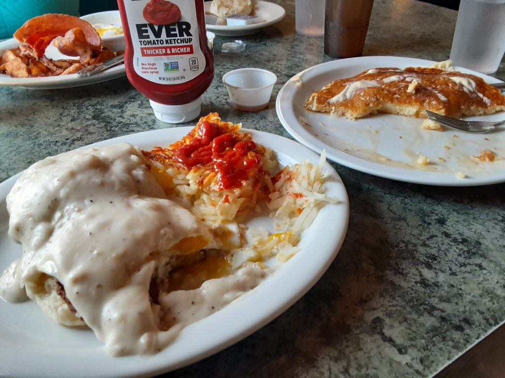 I was able to get my pancake, which was wonderful, and topped it off with some country eggs benedict. The difference being traditional eggs benedict and Country Benedict is is that traditional are fancied up with things like hollandaise sauce while country just flat-out accepts that your over-indulging and gives you everything from sausage to biscuits and gravy. It was all amazing and the service was fast and incredible. Perhaps they were trying to hurry us out so they could finish their white supremacist meeting.