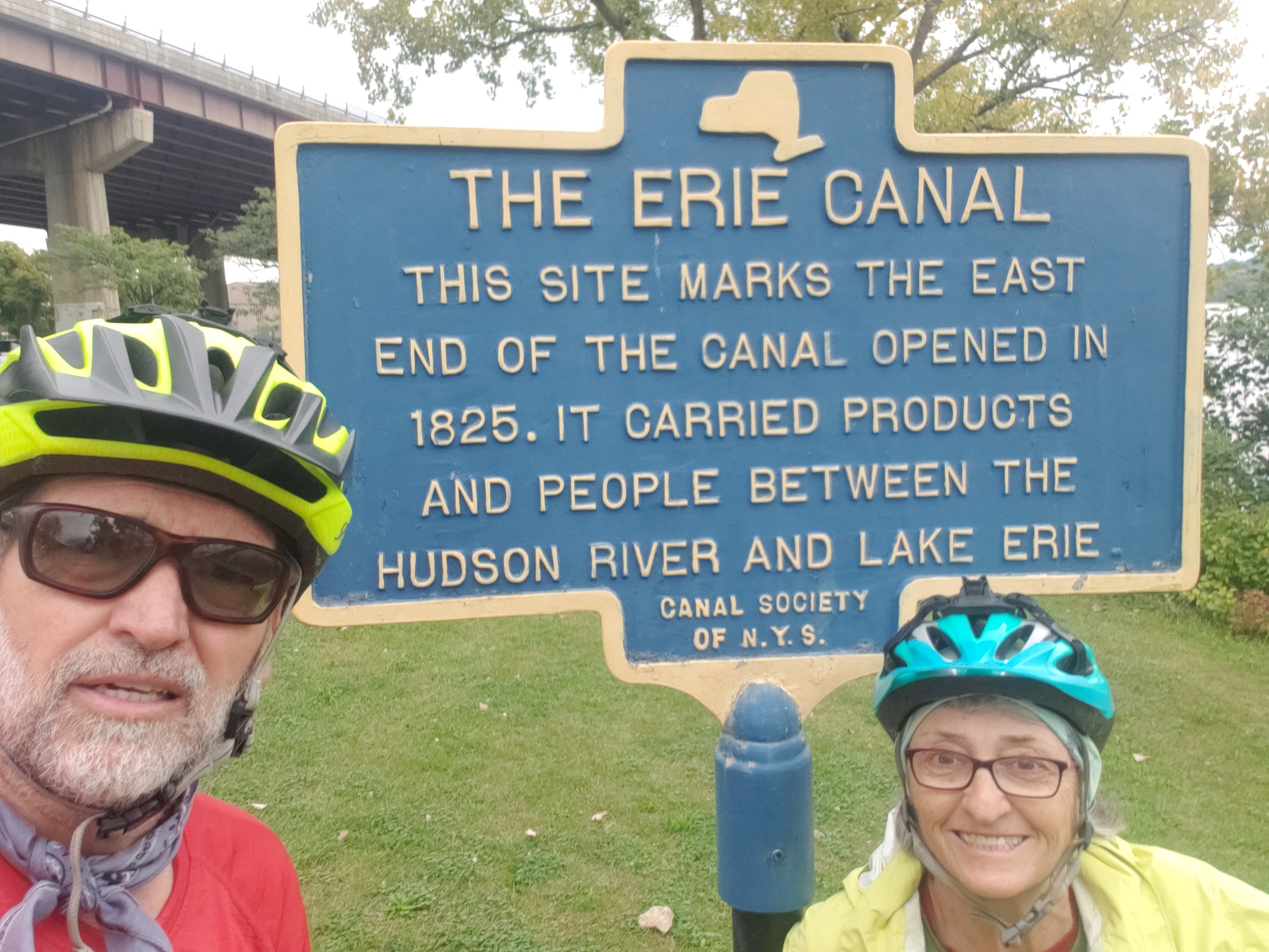 Everyday we get up early (at least by our usual time), get on the road quickly, and hope to arrive at our destination. It never happens. We pound through the first 30 – 40 miles in good form and quite quickly. Then stuff starts happening. Like I have to be on a zoom meeting. I can bike, talk, and meet (lots of oxygen at this elevation but sometimes have to stay in one location for internet. It rains and we have to swim, which is much slower than riding. Or, like today, we got to Albany but had to pedal into the city (Albany) to find a bathroom. The ones on the trail – not surprising for NY – were locked. We also tried to find a Verizon dealership but Google took us to a Verizon office (locked). We needed Verizon because Gloria tried to teach her phone to do the backstroke, but failed, phone couldn’t swim, and it sank (day it rained).
