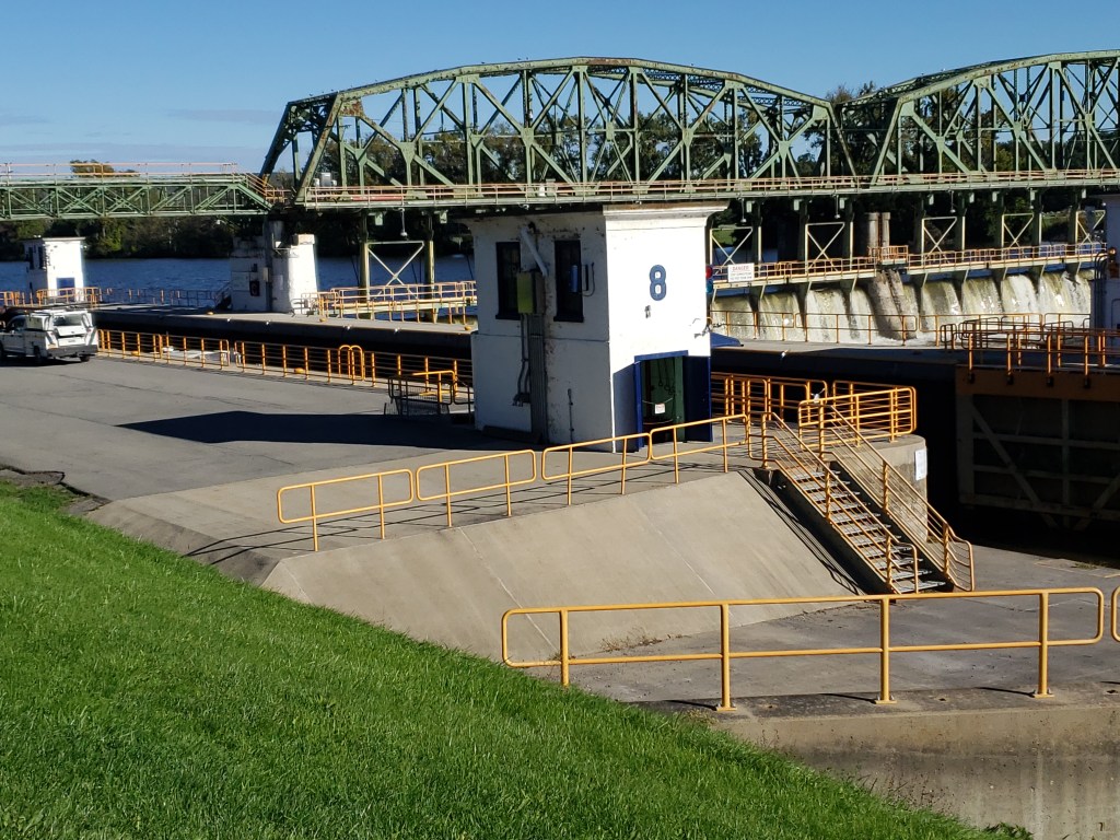 Along the trail today, we were fortunate to come upon a lock on the Mohawk River. Notice the boat in the lock, next to the parked car. Then look through the other pictures noting the boat going lower and lower. Then, in the last picture, you see the lock open and the boat coming out a good 20 feet lower, below the dam. Impressive enough in this century but unbelievable for the 19th century when the original locks were built – not to mention the aqueducts which I will try to discuss/show tomorrow.