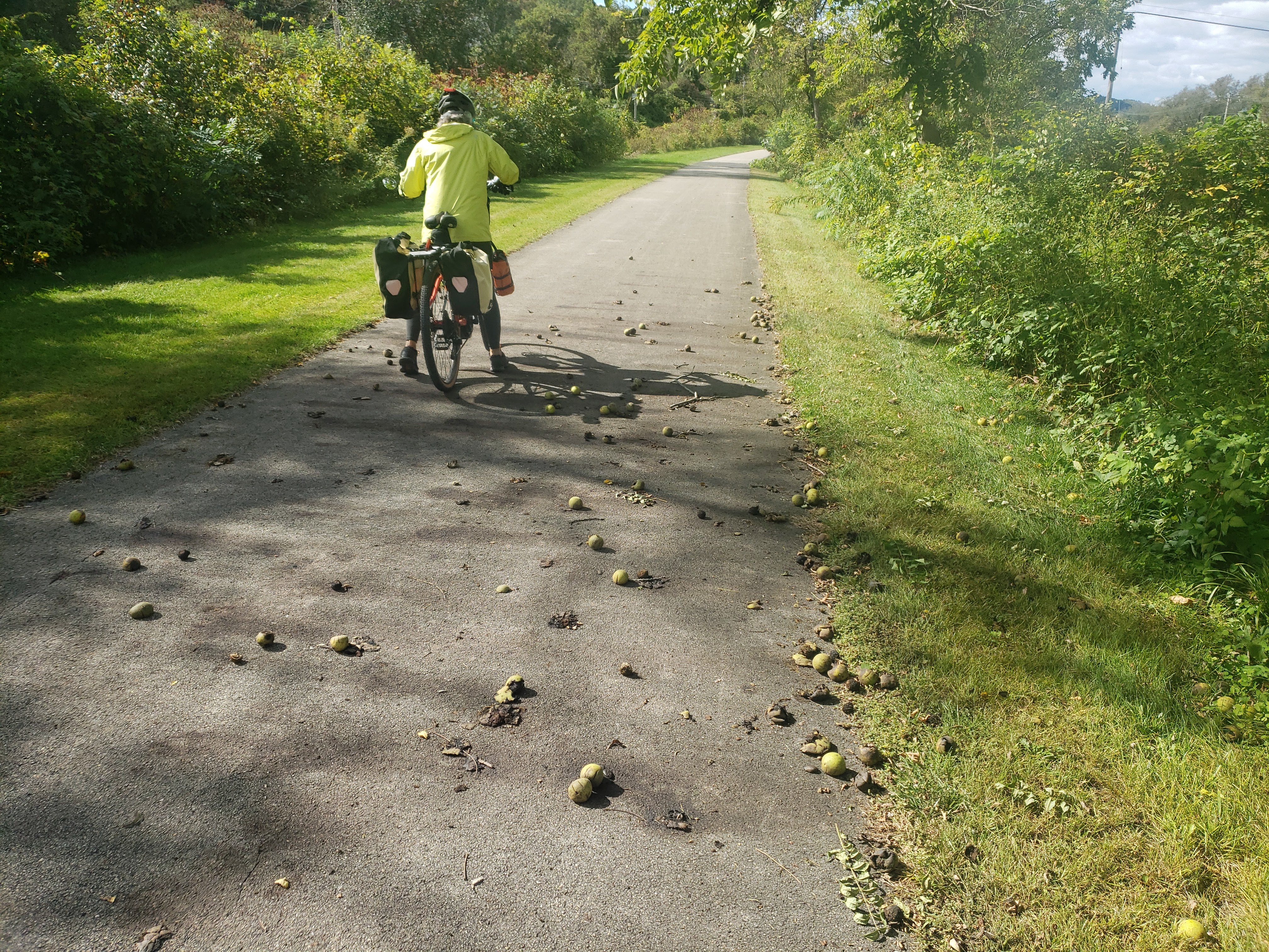 In the west, about the only thing you find an abundance of is pine trees. However, pine cones are not exactly a delicacy. Pine nuts are good, although expensive, and I’ve never actually eaten them in the wild. In the East, food falls off the trees and is so plentiful – apparently – they just leave it lying on the trail. In this case they are black walnuts. The fresh nuts, with a husk, are the size of a lime and can completely derail a nice bike ride if you hit them. There are also apples littering the trail in spots – unbelievable and beautiful.
