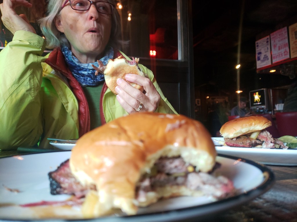 Food is a great reason to ride further. The further I ride, the more food I can eat without getting too fat. It’s also fun to ride to new food. This morning, being the overly friendly guy that I am (and because Gloria stopped to talk to them), I visited with two locals on the trail. When they heard we were going to Syracuse they said stop at the Dinosaur BBQ for lunch. We did. The two guys on the trail are now our best friends – whatever their names. The BBQ was the best brisket I’ve ever tasted.
