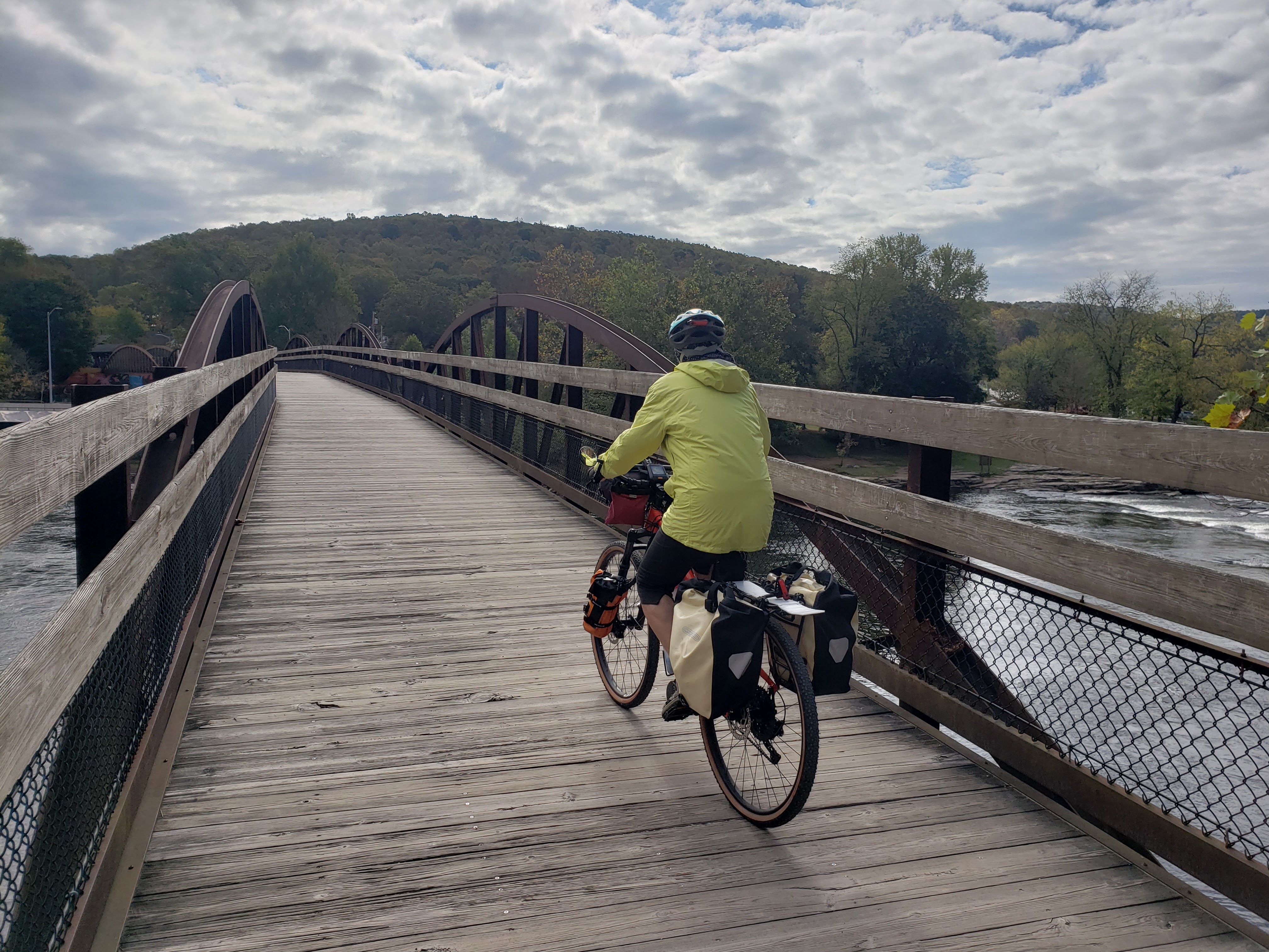 Gloria is taking thyroid medication so technically she is taking hormones but otherwise we can pass a drug test. The trail has been wonderful and with relatively abundant amenities. Especially when we compare it to 50 mile stretches on the Great Divide with a bar or gas station at either end. I even had a private flush toilet in Ohiopyle (we’ll get to that later). The trail surface is almost as good as pavement and the grade has never been more than 3% (rail trail) although we continue to go up stream toward the East Coast Continental Divide – a real thing. We cross its lofty heights tomorrow at a breathtaking 2392 feet above sea level. I gest, but I can’t deny that it is incredibly beautiful mile after pleasant mile even without tall mountains.