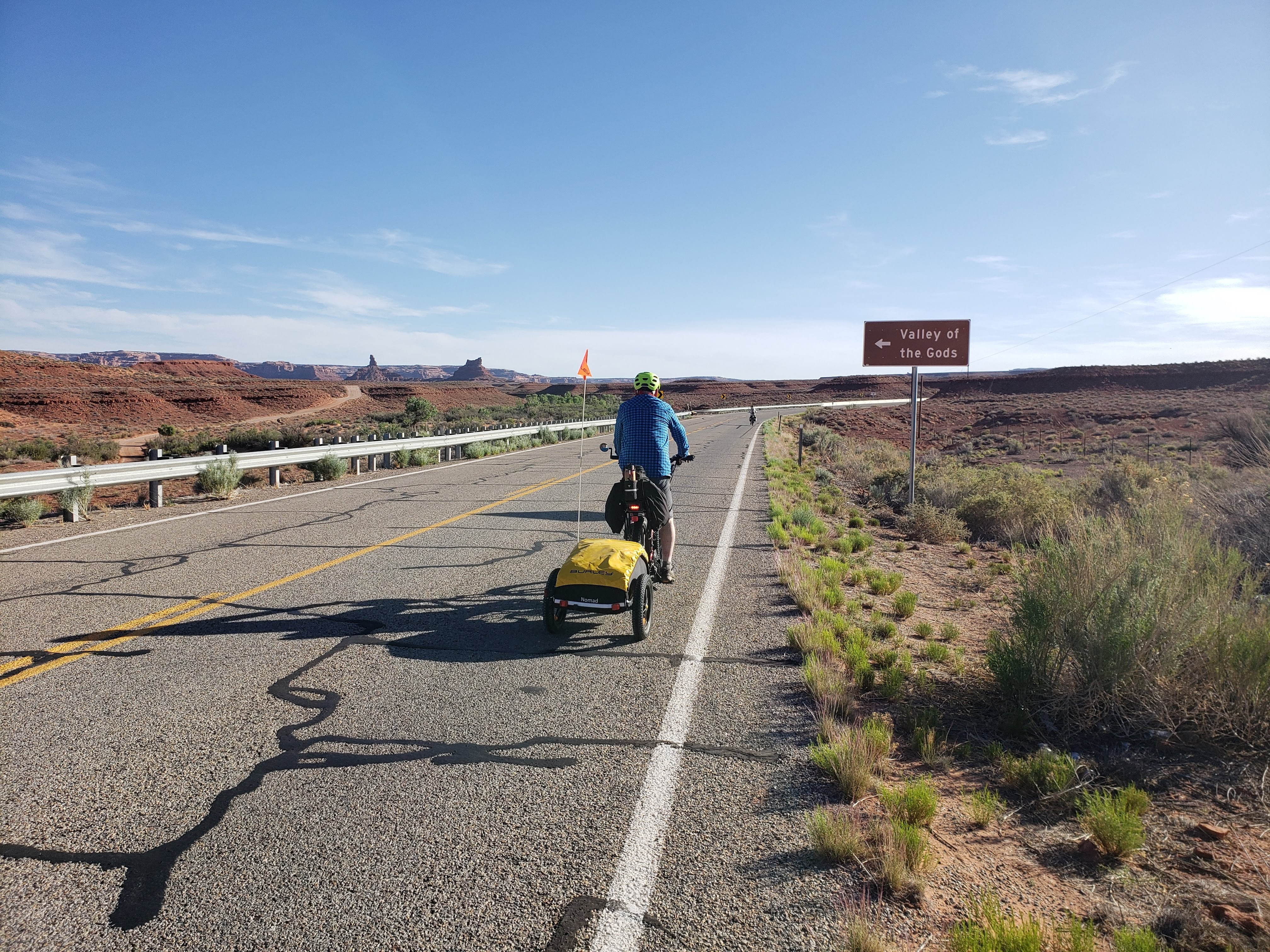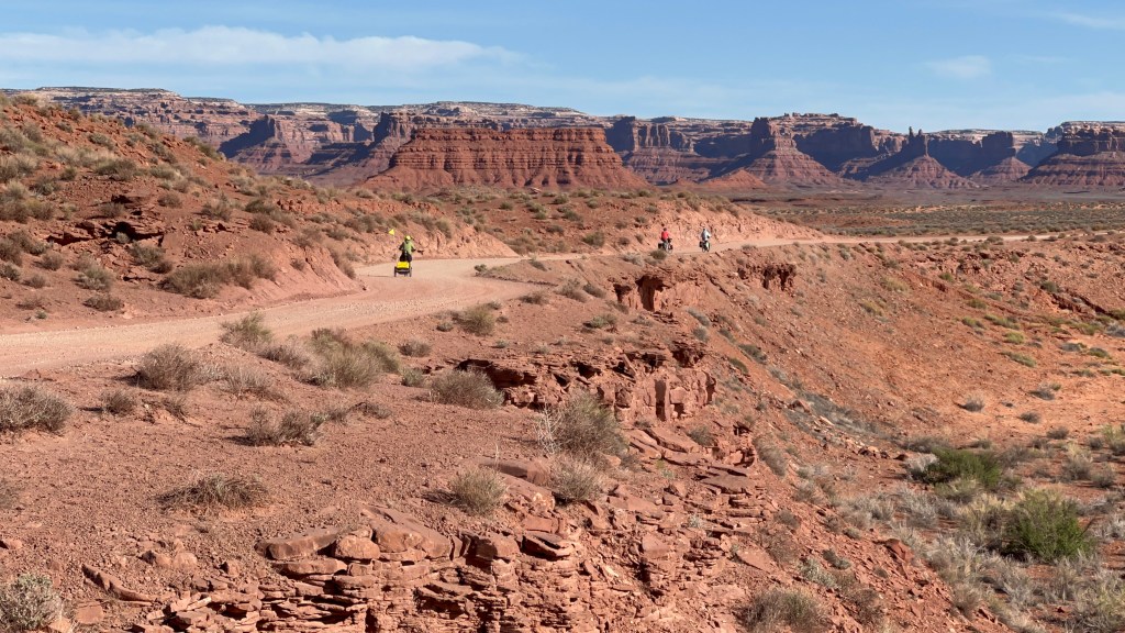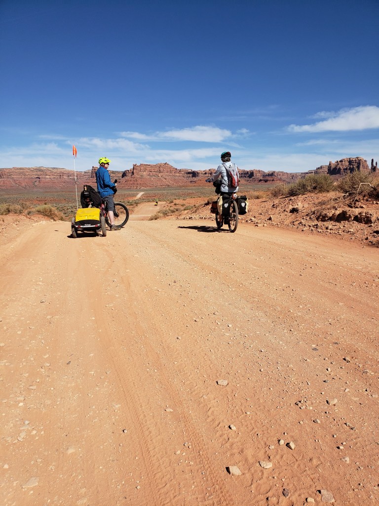 We were enroute before the cafe in Mexican Hat had even opened. That’s not too impressive as they likely open whenever they finally wake up although seeing them yesterday I would not exactly call them woke. Anyway, the weather was perfect with cool air and blue sky. The first few miles zipped by on pavement with nearly no traffic. As we turned onto the Southeast entrance to VOG, we began riding on dirt for the first time. We stopped to have a little breakfast – later in the day, I would personally regret any pause along the route but at the time it was a pleasant stop.