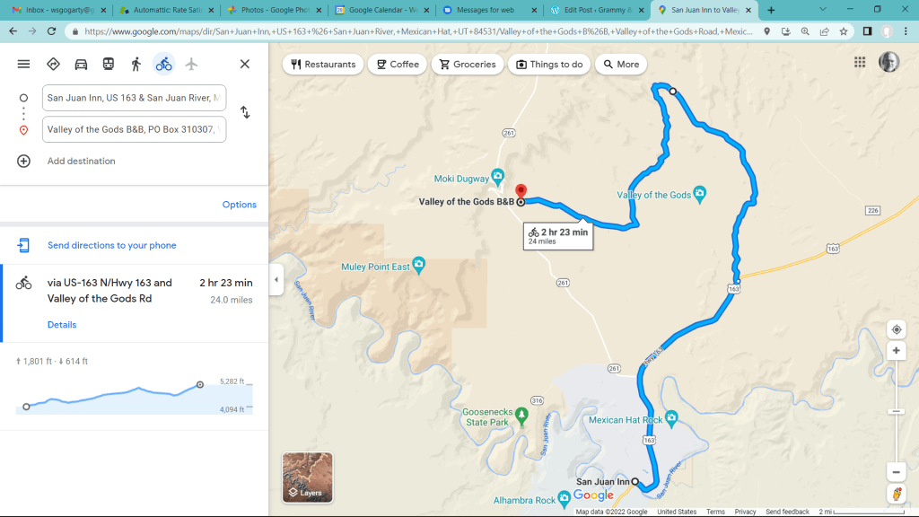 VOG is not Monument Valley, but it is the same type of formations and you don’t have to hire a Navajo guide to get through it. In fact, a bike was the perfect transportation to slowly enjoy the scenery. The dirt/gravel roads meant the few drivers along the route were driving slowly and made sharing the road easy. We even stopped and helped take pictures of people from Maryland and Belgium and them of us. Surprisingly, Gloria didn’t know the people from Belgium. The ride went well and as we left most of the rock towers, we still had a few miles to reach the VOG B&B near the Northwest entrance.