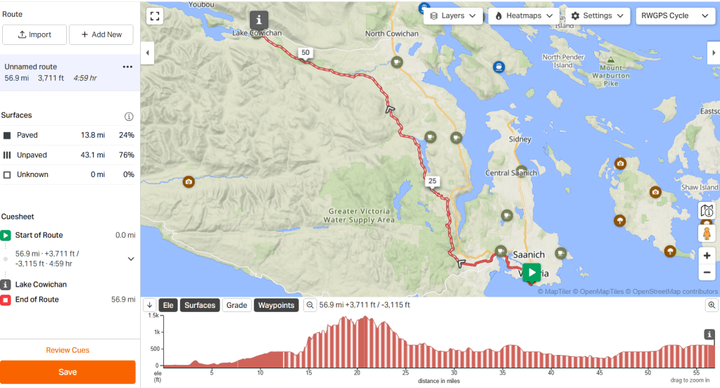 Day 1 – Victoria to Lake Cowichan. 64.6 miles. 4334 feet of vertical. Weather perfect!
