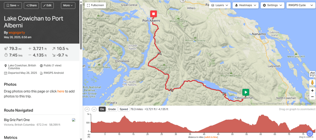 Day 3: Lake Cowichan to Port Alberni. 79.2 MI. 3721 feet elevation.