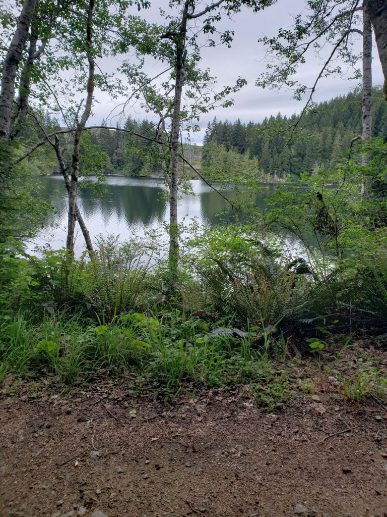 The first order of the day was torture. The route took us out of town briefly on the highway, lulling us into believing this would be easy. Then the route veered sharply off and into the trees, heading up a rocky, narrow road that was essentially hike-a-bike for the next hour. The discouragement of the climb was only heightened as I started descending towards Lacey Lake on a terrible, rocky logging road. Partway down, my GPS indicated I was off route. I turned around and climbed back up to the top of the hill, still not knowing where the trail went. Once again, I started down and thankfully found the trail. It was just a narrow few feet between some boulders dropping off into the forest. Thankfully, once I got to Lacey Lake, the ride from there was beautiful along a tree-lined stream that opened into a vast lake.