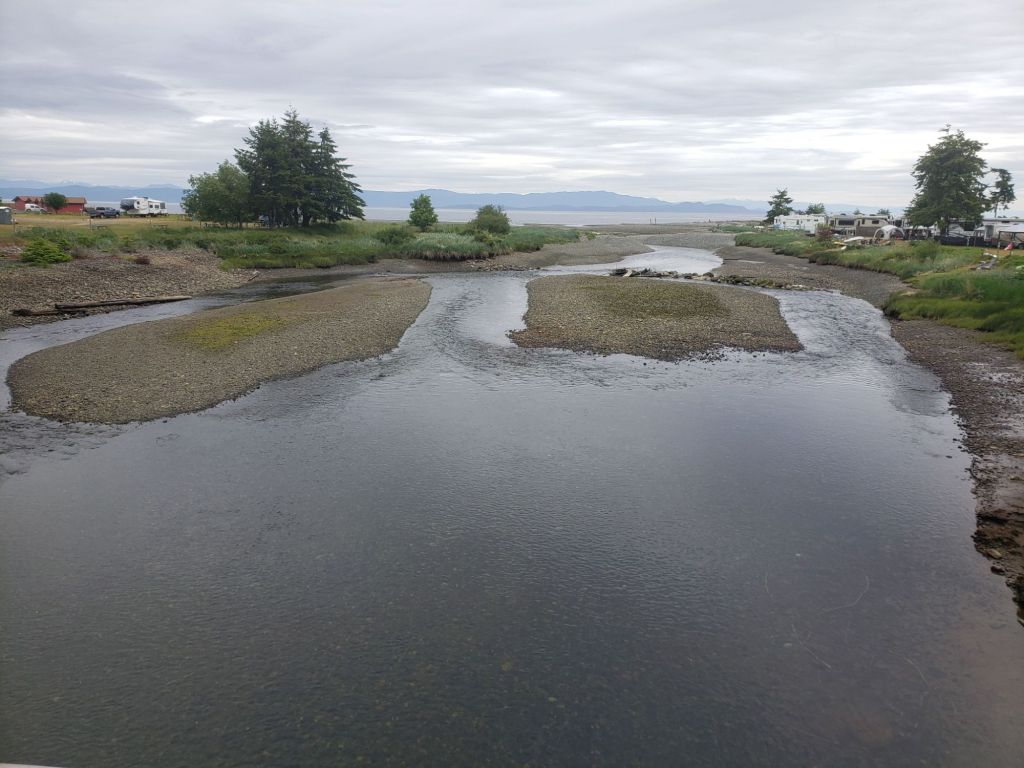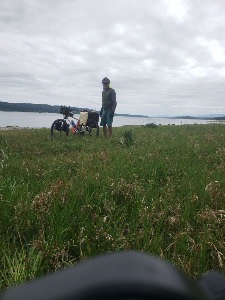 Not surprisingly, the river brought us to the ocean and the east coast of Vancouver Island. We could look eastward and see beautiful mountains rising above the sea. Or at least I could. Wilson was actually stuffed inside one of the feedbags and unable to see.