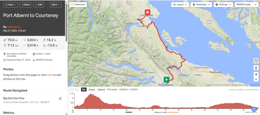 Day 4: Port Alberni to Courtney. 70.6 mi. 3834 FT elevation. Weather perfect.