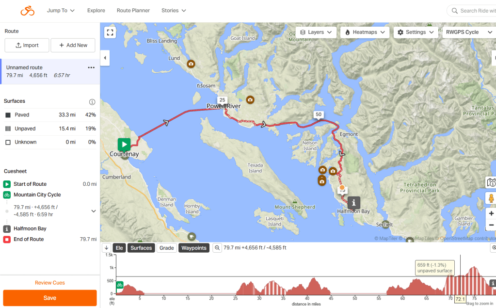 Day 5: Courtney to Rock Water Resort. 75 MI. 5200 ft of vertical. Weather perfect. These are estimates, since my GPS couldn’t handle the ferry crossings.