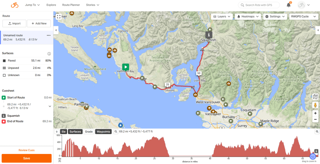 Day 6: Rockwater Stone Cove Resort to Squamish. 60 miles. 3600 ft vertical. Weather wet.