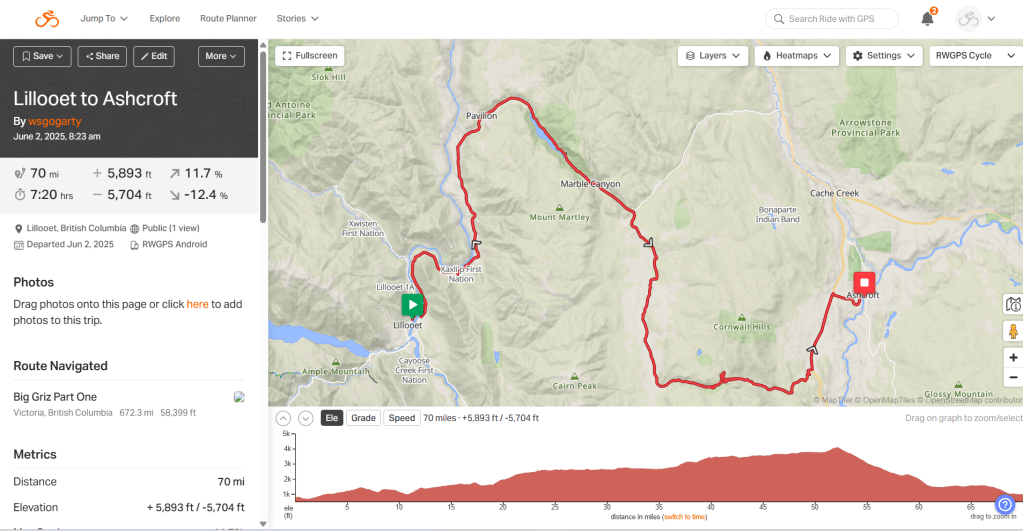 Day 10: Lillooet to Ashcroft. 70 miles. 5893 feet elevation. Weather perfect.