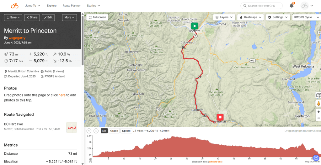 Day 12: Merritt to Princeton. 73 miles. 5219 feet elevation. Weather perfect