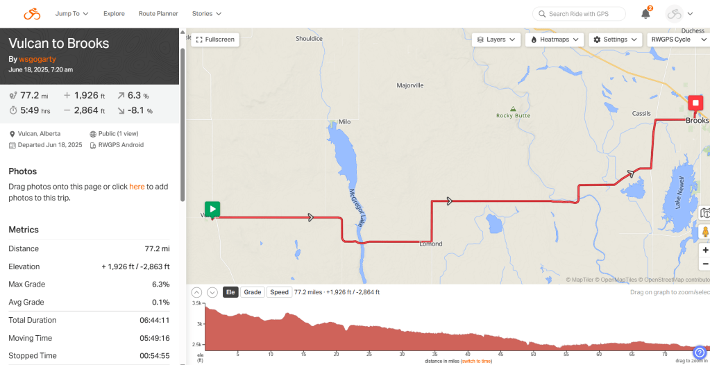 Day 25: Vulcan to Brooks. 77 miles. 1925 feet elevation. Weather lovely.