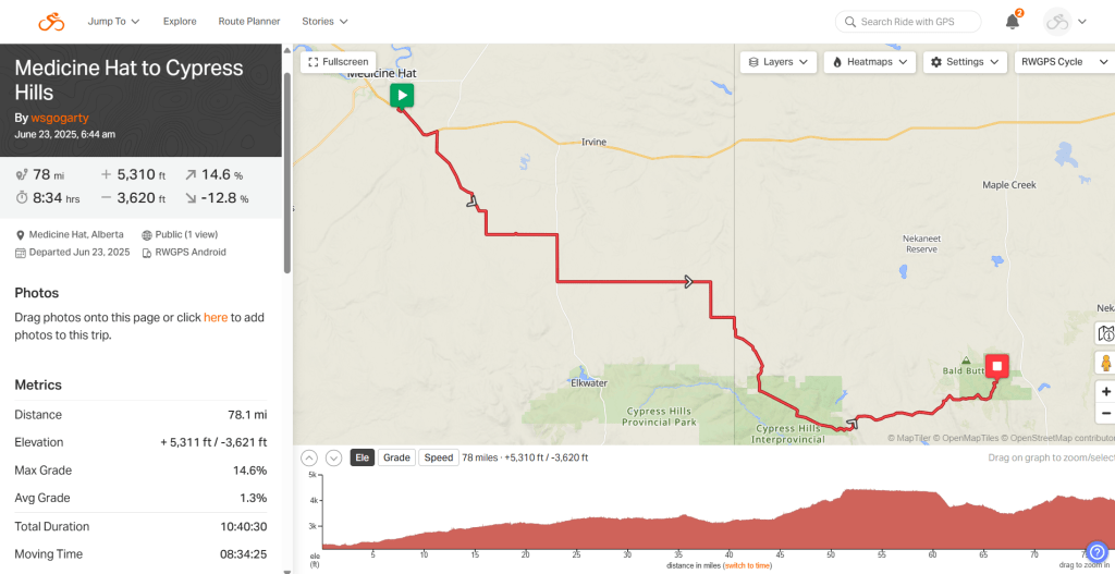 Day 30: Medicine Hat to Cypress Hills. 78 miles. 5300 feet elevation. Weather windy