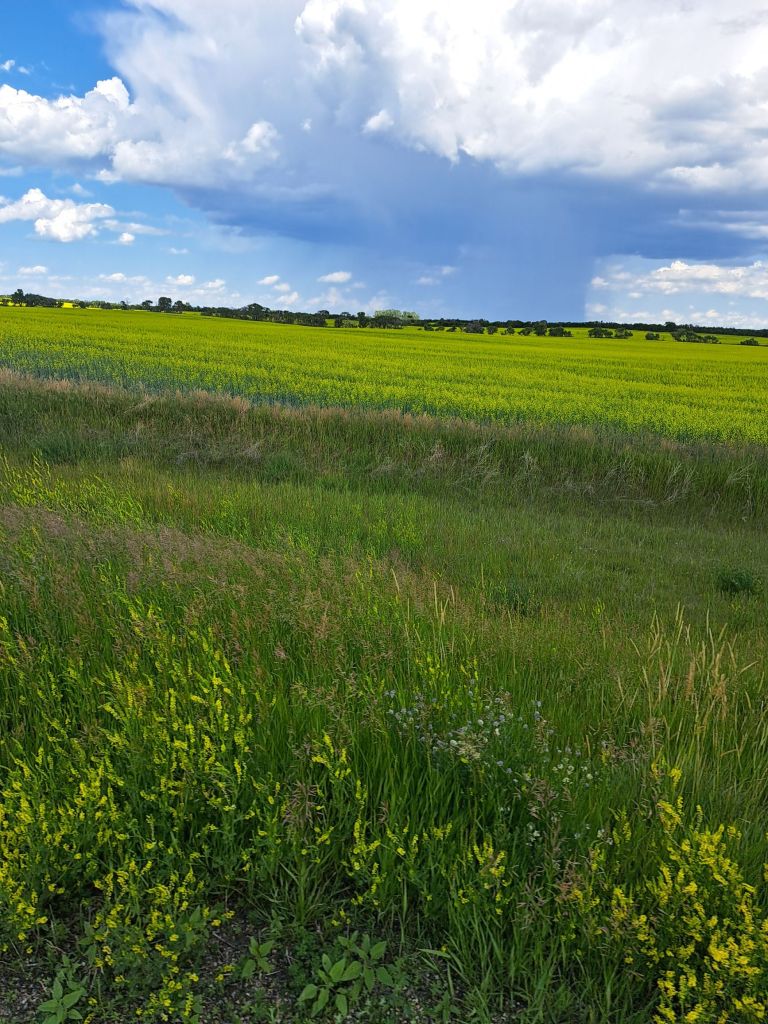 After my mud experience on Monday, I admit I have a little PTSD. There are several warnings along the route suggesting alternatives if it’s raining, to avoid getting stuck in the mud. There wasn’t any rain forecast. However, one dark cloud in the sky just about makes me wet my pants, especially when I’m miles from any visible signs of humanity except for planted fields. I tried to remember my German from 9th grade in Findlay, Ohio, because I passed a Hutterite colony, and if it rained, I’d be begging them for help.