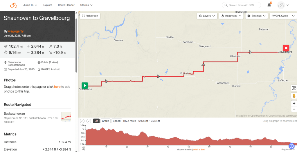 Day 32: Shaunovan to Gravelbourg. 102 miles. TOTAL TO DATE (TTT) 1900 miles, 2600 feet elevation. Weather mostly cooperative.