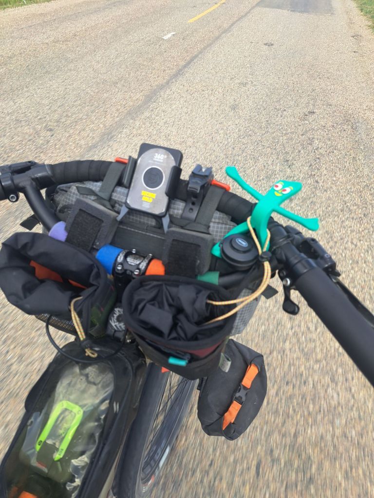 Because of these bad previous parenting experiences, I’ve been worse than a helicopter parent on this trip. Since Gumby usually gets left when I take him out for a picture, I barely take him out. He’s been stuffed inside my Feed Bag (i.e., a bag with readily available food) on my handlebars. And while he’s been safe, with plenty to eat, he hasn’t been able to enjoy the ride. Tim’s comment prompted me to get Gumby out of the Feed Bag.