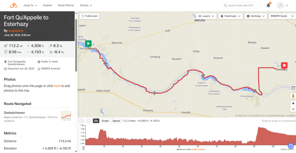 Day 34: Fort Qu’Appelle to Esterhazy. 112 miles. 4306 feet elevation. The weather was hot but helpful
