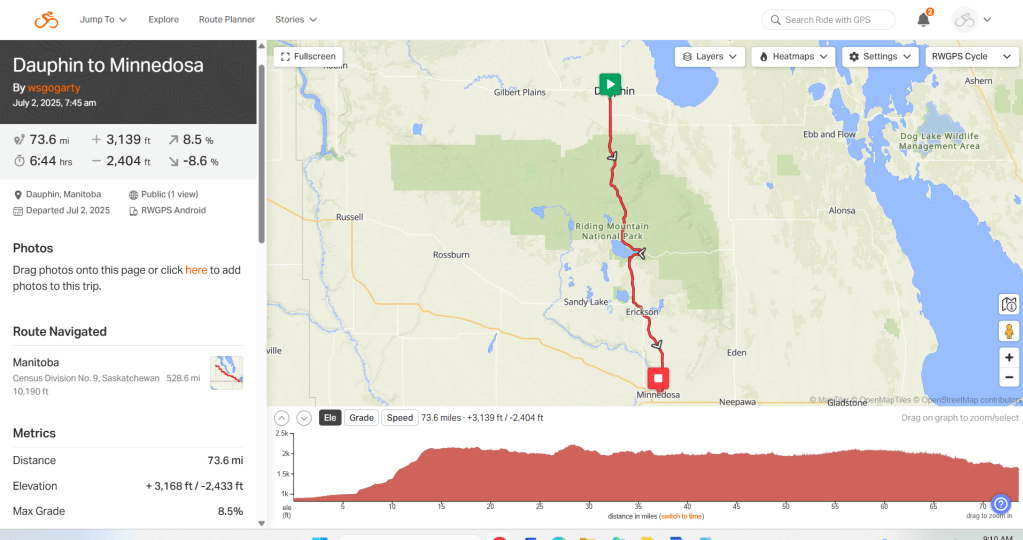 Day 38. Dolphin to Minnedosa. 74 miles. TTD 2464. 3100 feet elevation. Weather toasty
