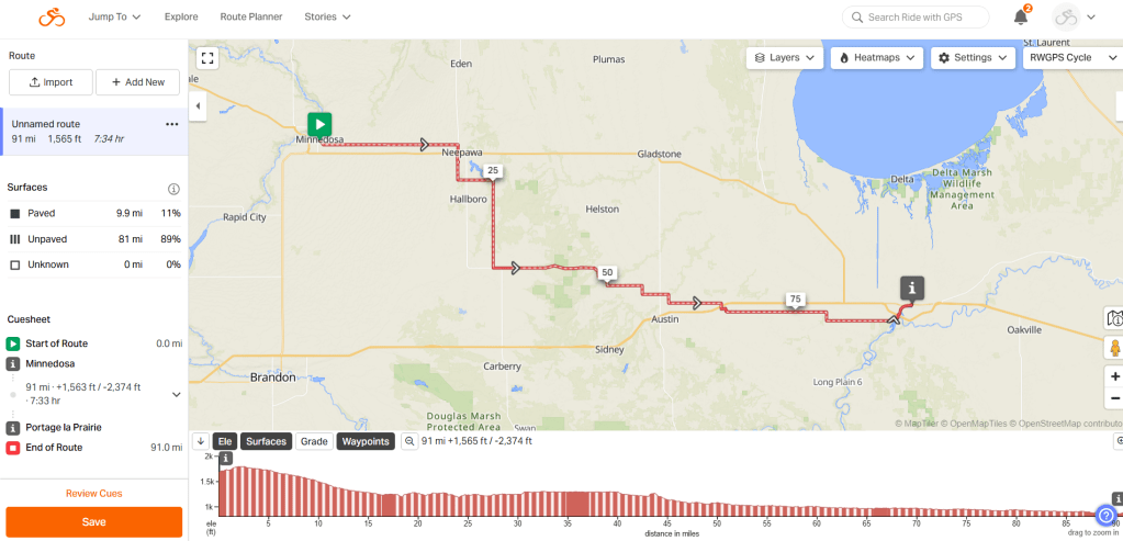 Day 39. 84 mi. Minidosa to Portage la Prairie. A few hundred feet of elevation. Weather painfully windy
