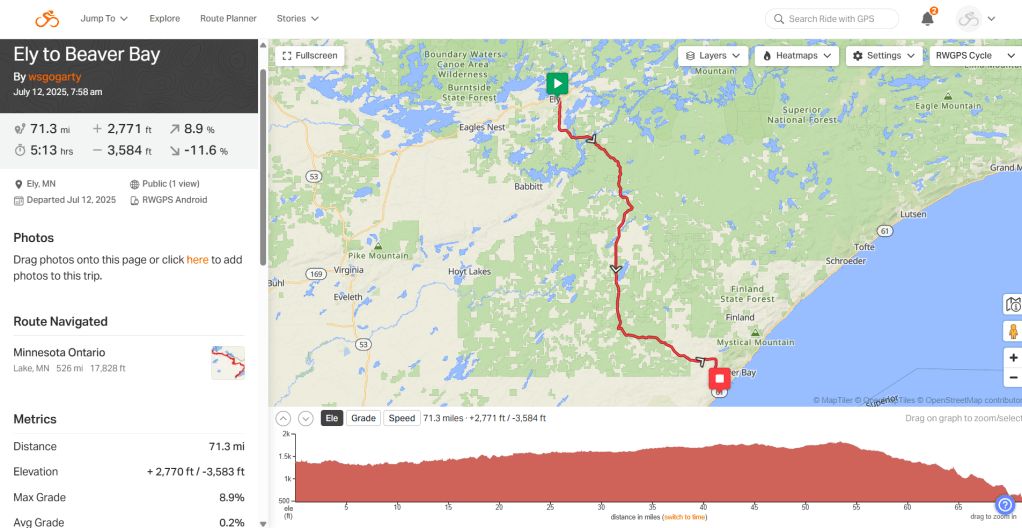 Day 48. Ely to Beaver Bay. 71 miles. 3091 TTD. 2770 feet elevation. The weather was foggy, but the wind was favorable.