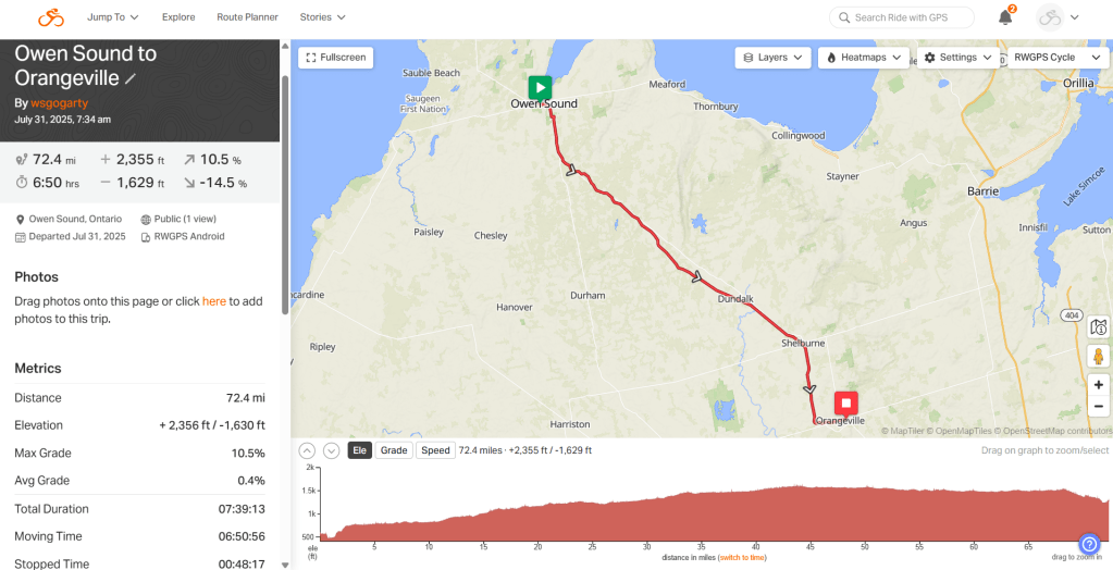 Day 65. Owen Sound to Orangeville. 72 miles. 3988 miles TTD. 2355 ft elevation. Weather comfortable but a little windy