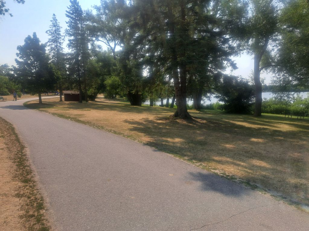 A few photos won’t do the town of Peterborough justice. It’s a relatively large community; in fact, large enough to have a homeless population. The city has made good use of the Otonabee River, which runs through it. The park along the river is beautiful. The restrooms next to the splash pad have wonderful flush toilets, which I’ve pointed out previously are critical for those of us with Giardia riding through towns on bicycles. They even had a kids’ triathlon going on while I pedaled through the park.