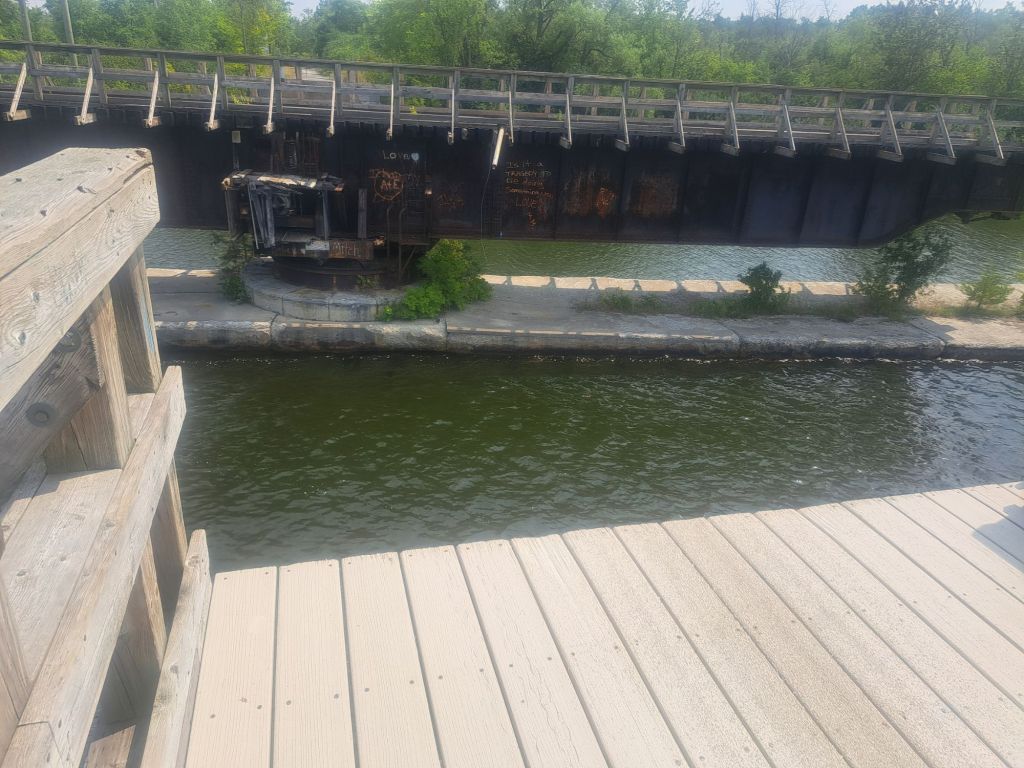 It’s difficult to appreciate what’s going on here, but if you look closely, there is a mechanical device under that piece of road across the water from the end of this bridge. That mechanical device is used to swing that piece of road/bridge so that it would abut the bridge. As I was pedaling down the trail, I came to a fence that I couldn’t open and a bridge behind it. I couldn’t quite tell, looking down the bridge, what was going on, and there was nothing to suggest I shouldn’t trespass. Two young men stood on the bridge, looking at the mechanism above. Interestingly, as I prepared to walk down the bridge past the gate, they jumped off, which made me wonder how I would cross it. In fact, after walking around the gate and down to the end of the bridge, I was grateful there was a gate because I would have ridden right off the end of the bridge. Once again, I had to reroute, but fortunately it wasn’t long and just took me down to another bridge, a kilometer or two away.