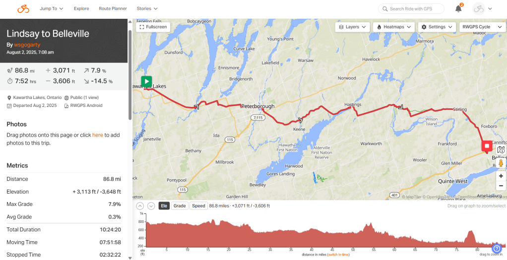 Day 67. Lindsay to Bellaville. 87 mi. 4,175 miles TTD. 3070 feet elevation. The weather was good, and the wind was mostly cooperative.