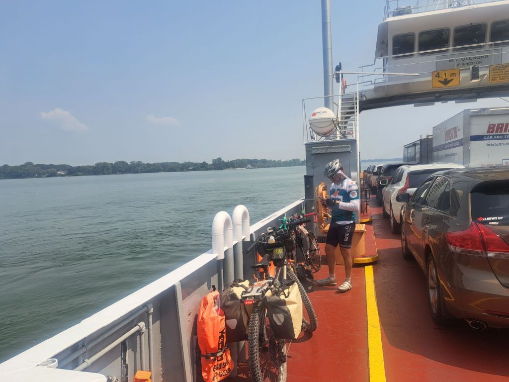 There was also another fun ferry ride today. This guy near my bike was riding with 200 other people on a fundraiser ride from Toronto to Montreal for the week. He was quite thrilled because he believed himself to be the first of the 200, and no other bikers got on the ferry with which put him 15 minutes or more ahead of everyone. He also seemed quite proud of the fact that they were doing 120 km today. I didn’t burst his bubble but simply smiled and told him to have a good ride as we pedaled off the ferry, and I continued my 135 km day with a fully loaded bike and fat tires.