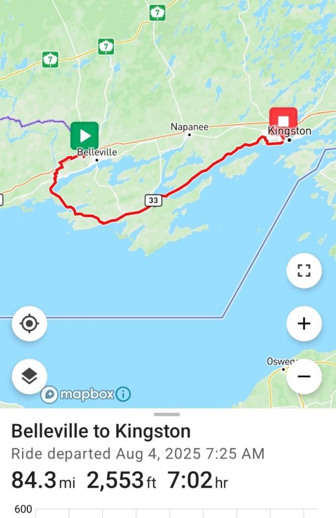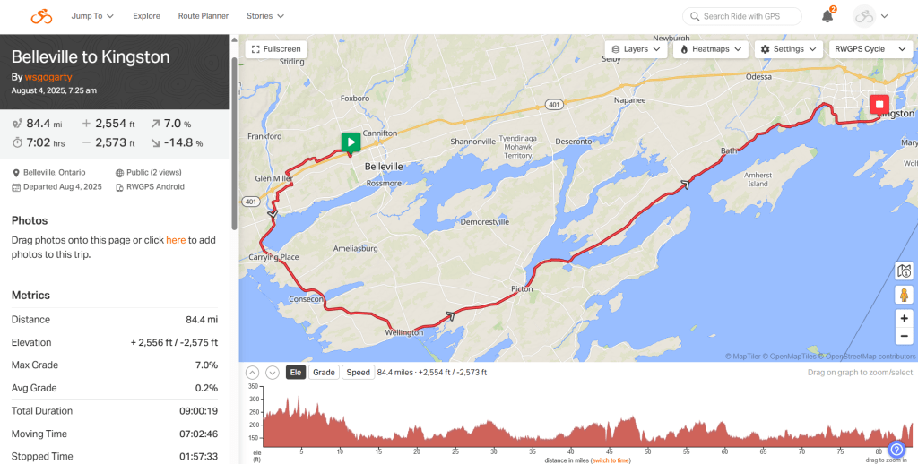 Day 69. Belleville to Kingston. 84 mi. 4259 mi TTD. 2553 ft elevation. Weather warm and winds favorable.