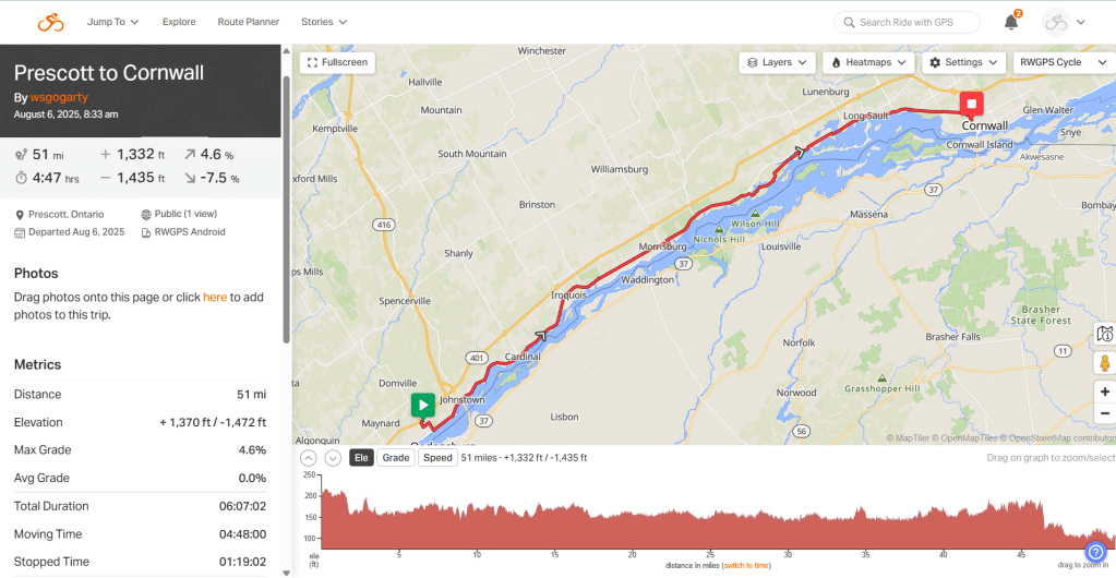 The ride along the St Lawrence continues to be beautiful. Of course, every day of this ride has shown me some type of beauty. Unfortunately, I didn’t always pause to appreciate it. Today, with only 50 miles to cover, I stopped multiple times. Heaven forbid I even went off route at one point to go to this park, sit down to eat, and look out on the river. I sat there long enough that the seagulls almost became a problem. BTW, that rectangle shape in the river in the first picture above is the local “swimming pool.”