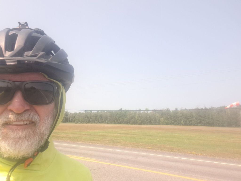 If you haven’t figured out by reading this blog that I may not be quite so bright, then either you’re not reading very closely or you’re not very bright. I suspect it’s the former. I hate selfies, but the four above are to illustrate that even that’s difficult for me. I was trying to get a picture of me and a wind sock. If you look really close in the last picture, you can just make out the tail end of the orange and white windsock. And yes, it’s blowing in the direction opposite of my riding.