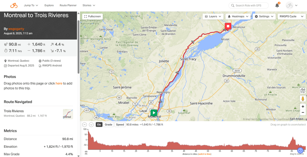 Day 72. Montreal to Trois-Rivieres. 91 mi. 4,560 Mi TTD. 1,639 ft elevation. Weather warm with helpful wind