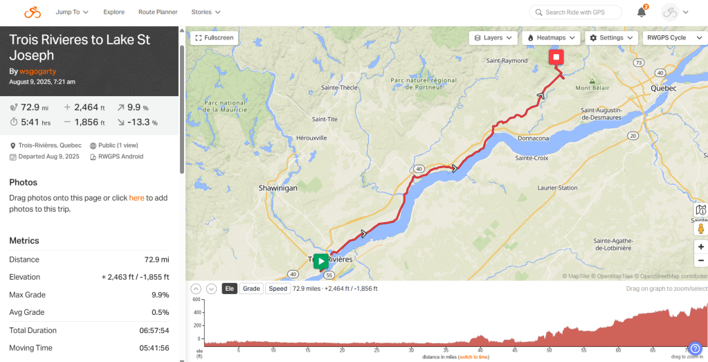 Day 73. Trois Rivieres to St. Joseph Lake. 73 mi. 4633 miles TTD. 2464 ft elevation. Weather was hot with wind pushing
