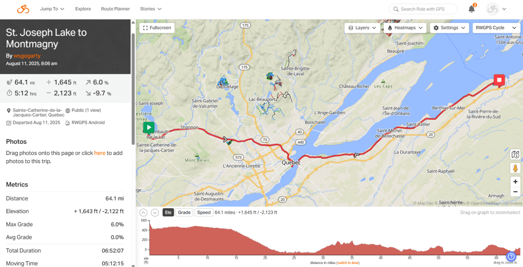 Day 75. St Joseph Lake to Montmagny. 64 mi. 4,697 Mi TTD. 1,644 ft elevation. The weather was hot and muggy, but there was a powerful tailwind.
