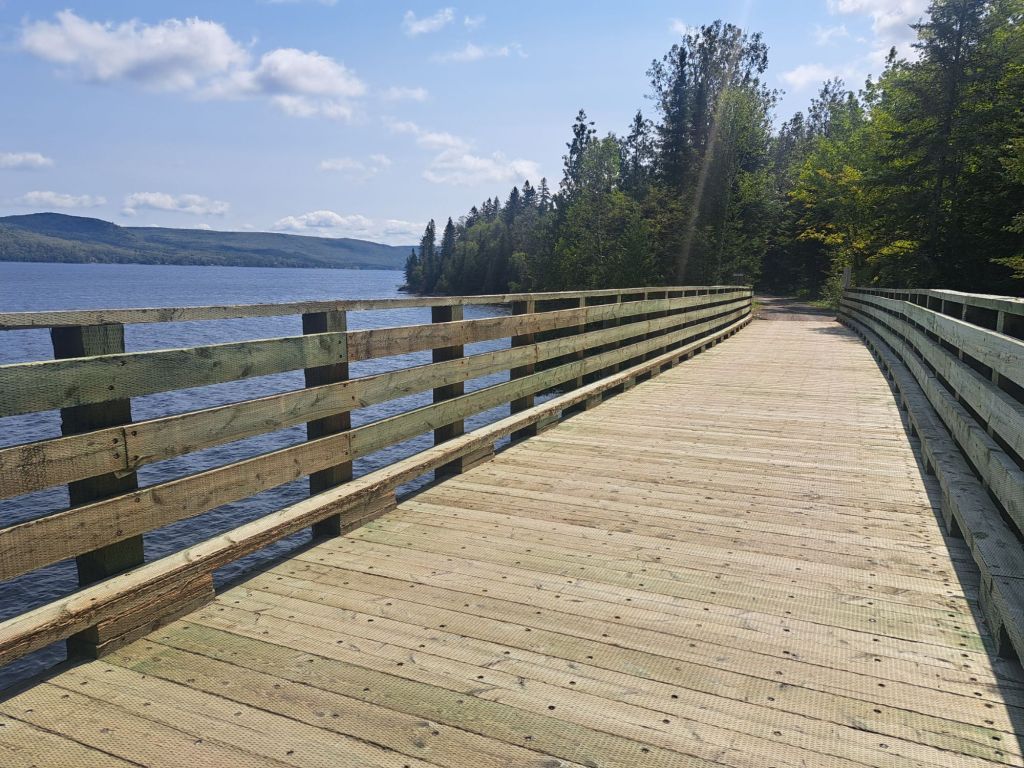 There is no way I could take enough pictures or good enough pictures to share the wonders of this rail trail along Lake Temiscuoata. It went on wonderfully for some 20 mi. There were trestles, rest stops, beaches, and fun little places to get snacks and treats. There were many people riding . It was so nice, I briefly considered changing our family bike ride this year from Prince Edward Island to this trail. I even stopped being mad about all the signs in Quebec only being in French.