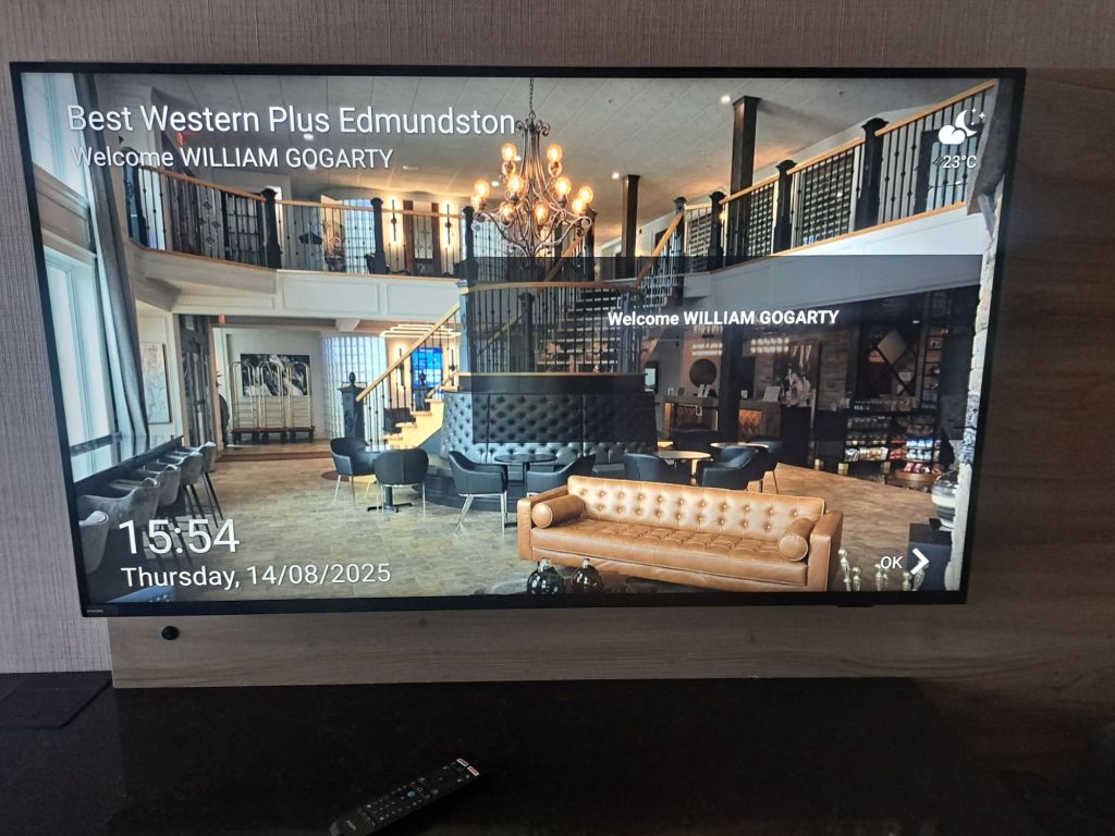 It’s possible that I’m staying in too nice of a hotel for tonight. This is the TV in my room personally welcoming me. I will probably need to eat about 30 lb of breakfast to make it worth the cost. I’m a wimp for not camping out, but I’ve had some interesting motel experiences. In fact, last night, I finally got to use my water filter. Entering the motel last night, the sign said. ” Water not drinking.” Once again, Quebec was trying to kill me, but at least this notice was in confused English, so I knew to use my filter.