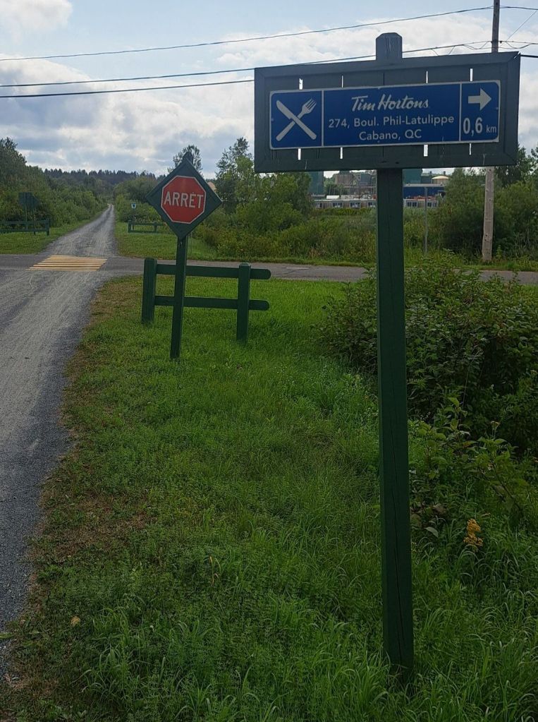 Sorry, but I do have to make note of the fact that on a dirt trail for bikes and pedestrians, there is actually a sign for where the next Tim Hortons can be found. Tim Hortons is serious in Canada.