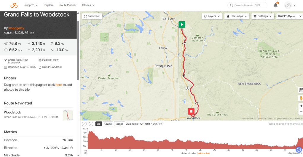 Day 80. Grand Falls to Woodstock. 77 mi. 5002 miles TTD. 2140 ft elevation. The weather was warm with a little headwind.