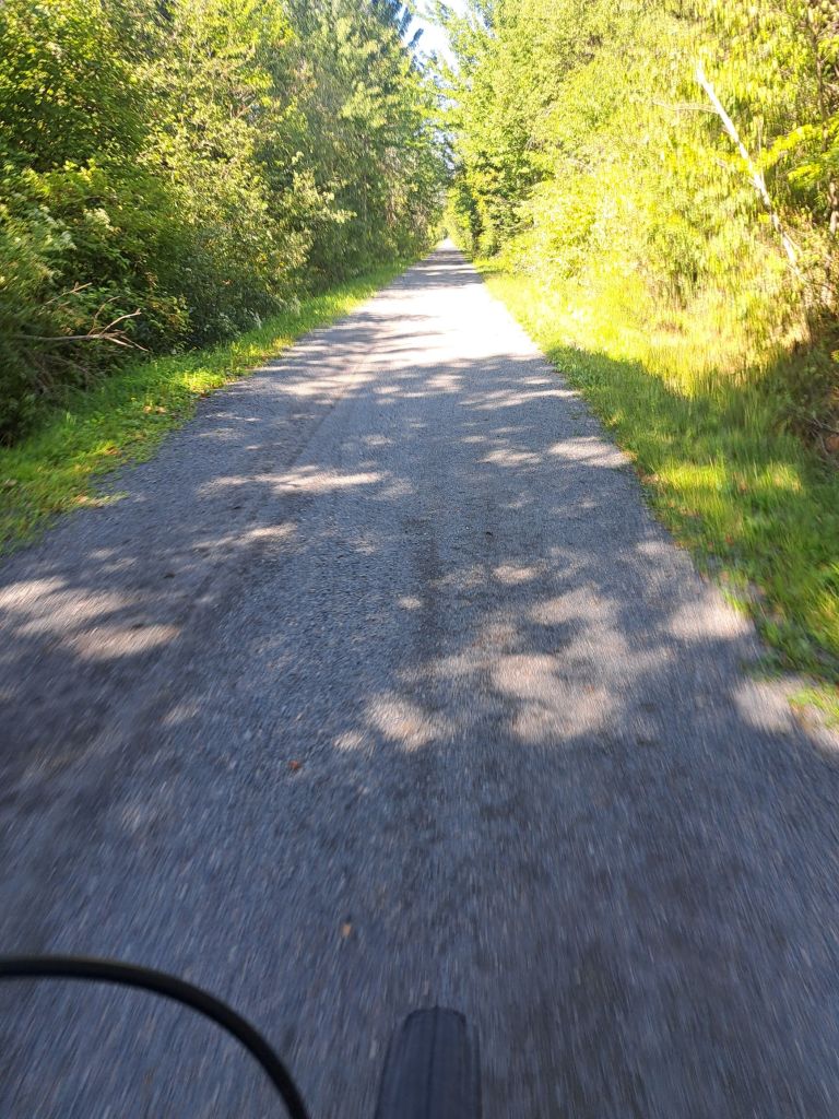 As I rounded a corner on the road after about 30 miles, I noticed a trail extending into the woods. It was a beautiful trail. There was a gate, but it was open. There were no cones or barriers. It was a rail trail. I decided to risk the $25,000 fine, seeing how they were absolutely no indications the trail was closed. I rode for a few miles, and it was lovely. Then I broke out onto a road, and my GPS told me to take the trail, so now I was feeling relatively confident although I still hadn’t seen another person.