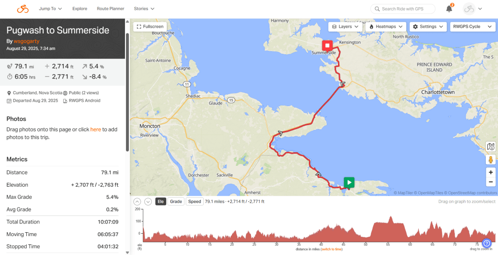 Day 93. Pugwash to Summerside. 79 mi. 5637 miled TTD 2,714 ft vertical. Weather perfect.